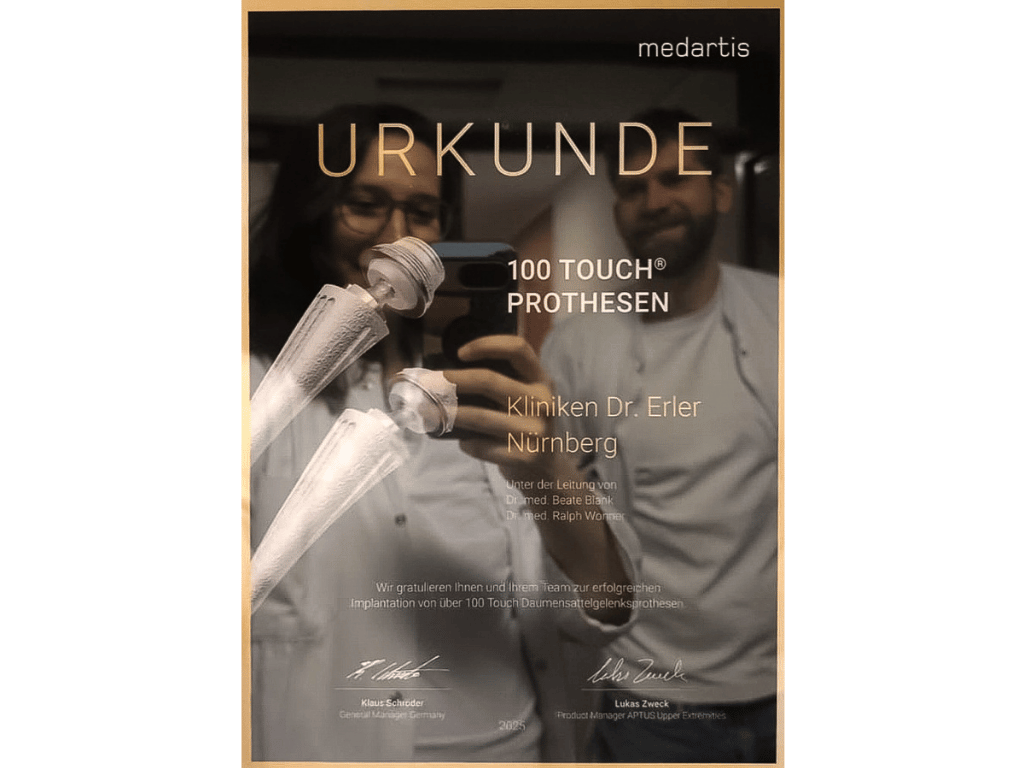 Die Urkundenübergabe erfolgte im Rahmen eines Besuchs des Prothesenherstellers MedArtis und würdigt die große Erfahrung des handchirurgischen Teams mit diesem speziellen Operationsverfahren. Die hohe Zahl der Implantationen zeigt, dass die Methode in der klinischen Praxis etabliert ist und vielen Patientinnen und Patienten eine nachhaltige Verbesserung ihrer Handfunktion ermöglicht.